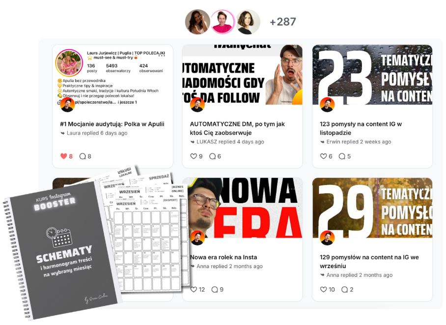Wiedza z tego kursu nie jest łatwo dostępna w Internecie. To konkretne strategie i autorskie rozwiązania, które w jasny sposób pokazują, jak zdobywać obserwatorów na Instagramie.